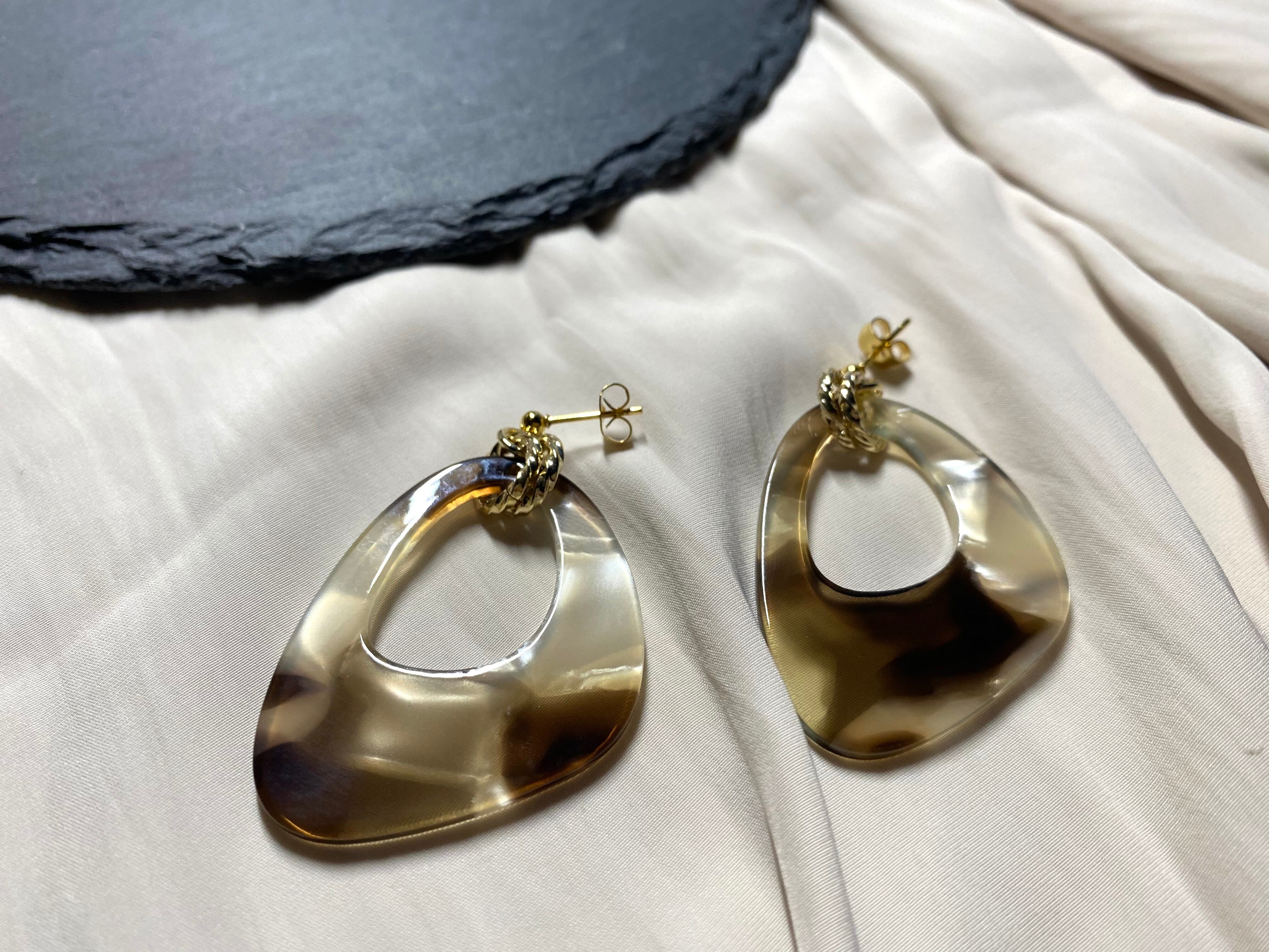 こちらの商品は、大ぶりな鼈甲風アクリルパーツをデザインリングと組み合わせた耳飾りです。