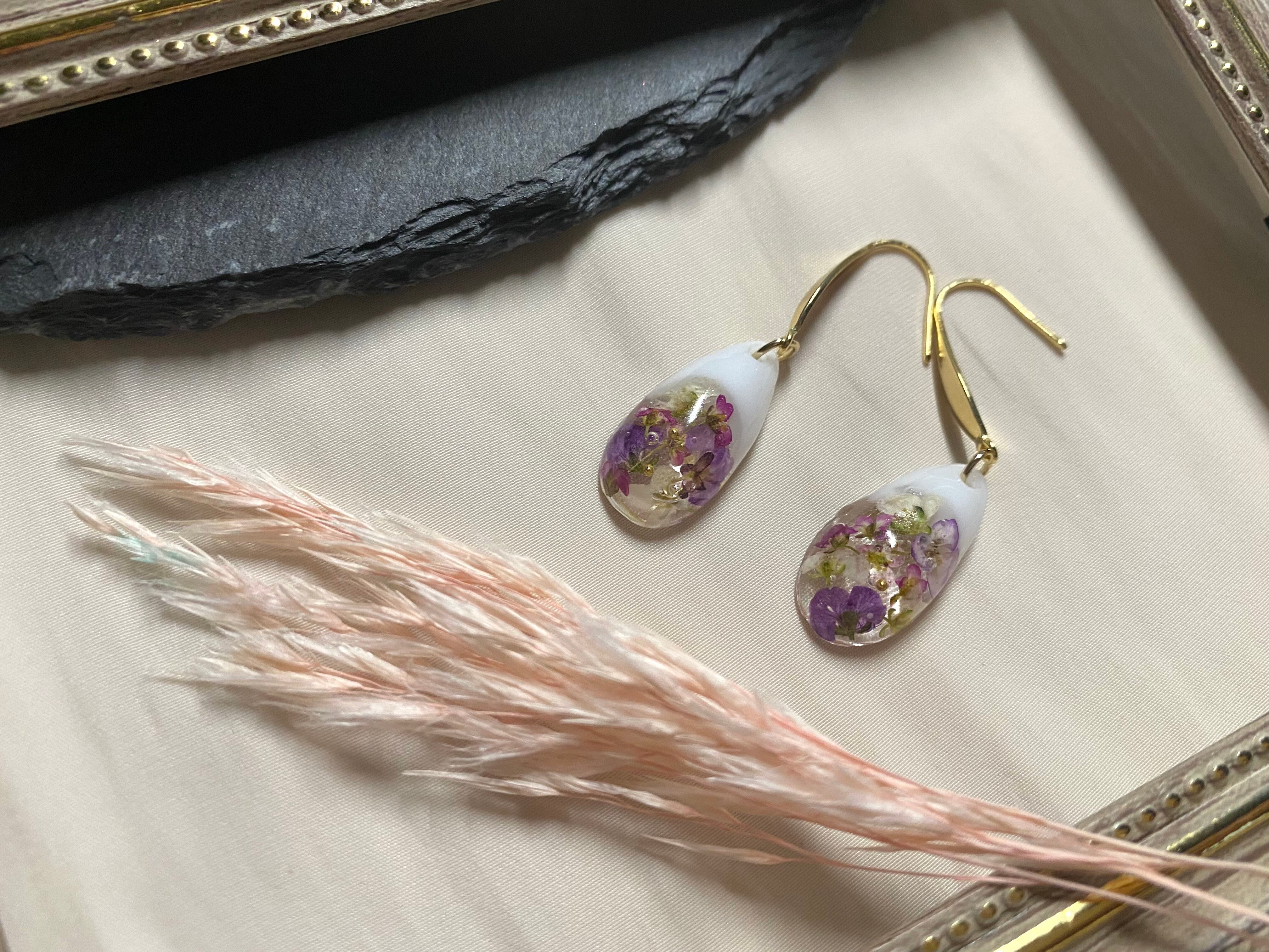 こちらは、雫型に形成し、中にドライフラワーを封入しているチャームのアクセサリーです。